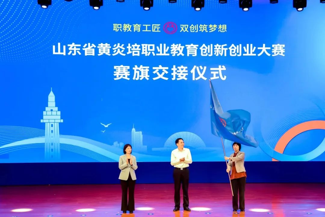 ▲向第八届山东省黄炎培职业教育创新创业大赛承办方威海市中华职教社授赛旗