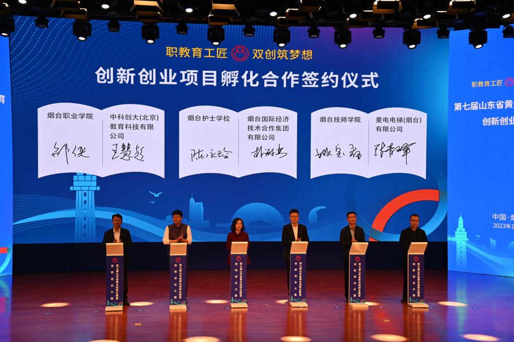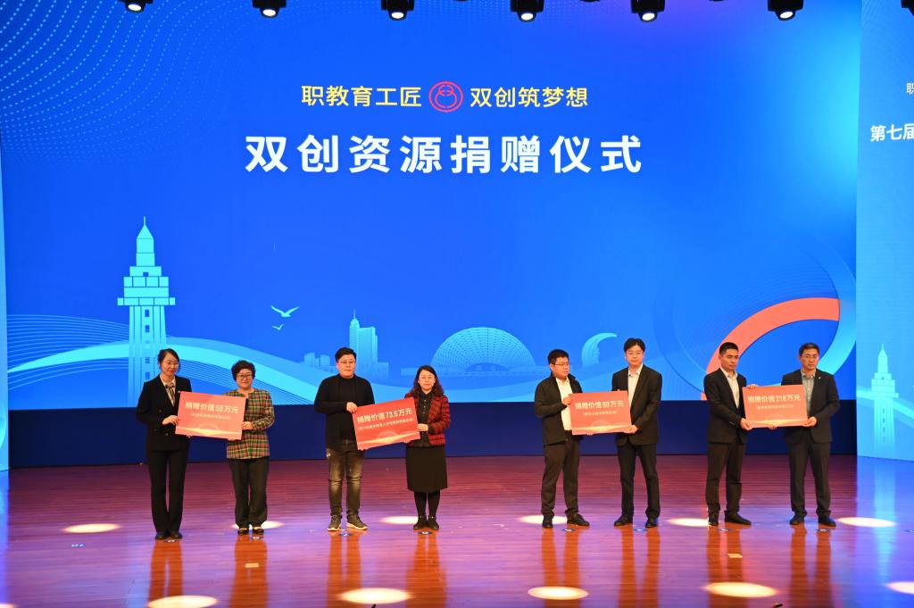 ▲部分职业院校与有关创业园区、企业代表签约、接受捐赠