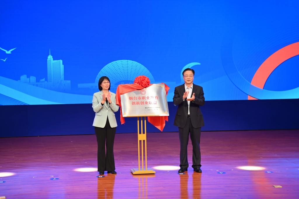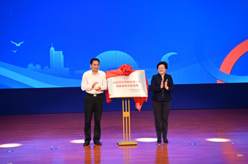 ▲孙中亮与陈新姿为“山东省中华职业教育社创新创业实践基地”揭牌