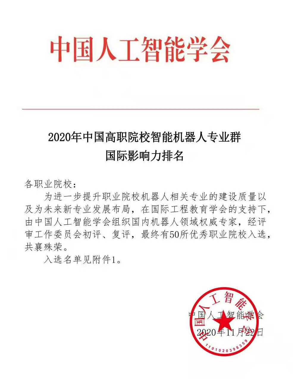 11月23日,2020第三届全球无人系统大会在广东珠海举行。新葡的京集团8814当选智能机器人(国际)产教联盟第一届联盟理事单位,并荣获中国高职院校“智能机器人专业群国际影响力50强”。